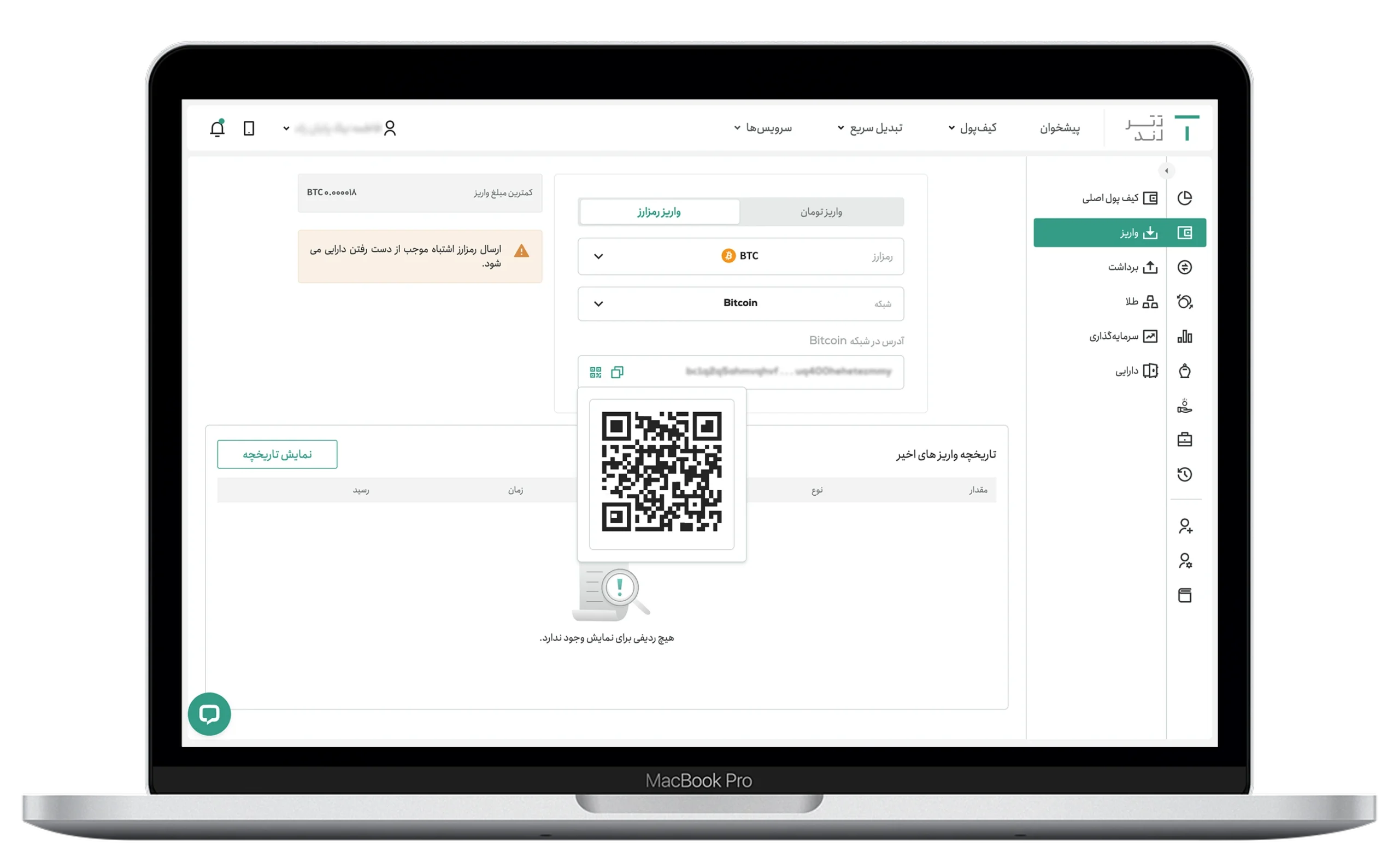 در این بخش، امکان واریز و برداشت فراهم است و همچنین میتوانید تاریخچه تراکنشهای خود را مشاهده کنید.