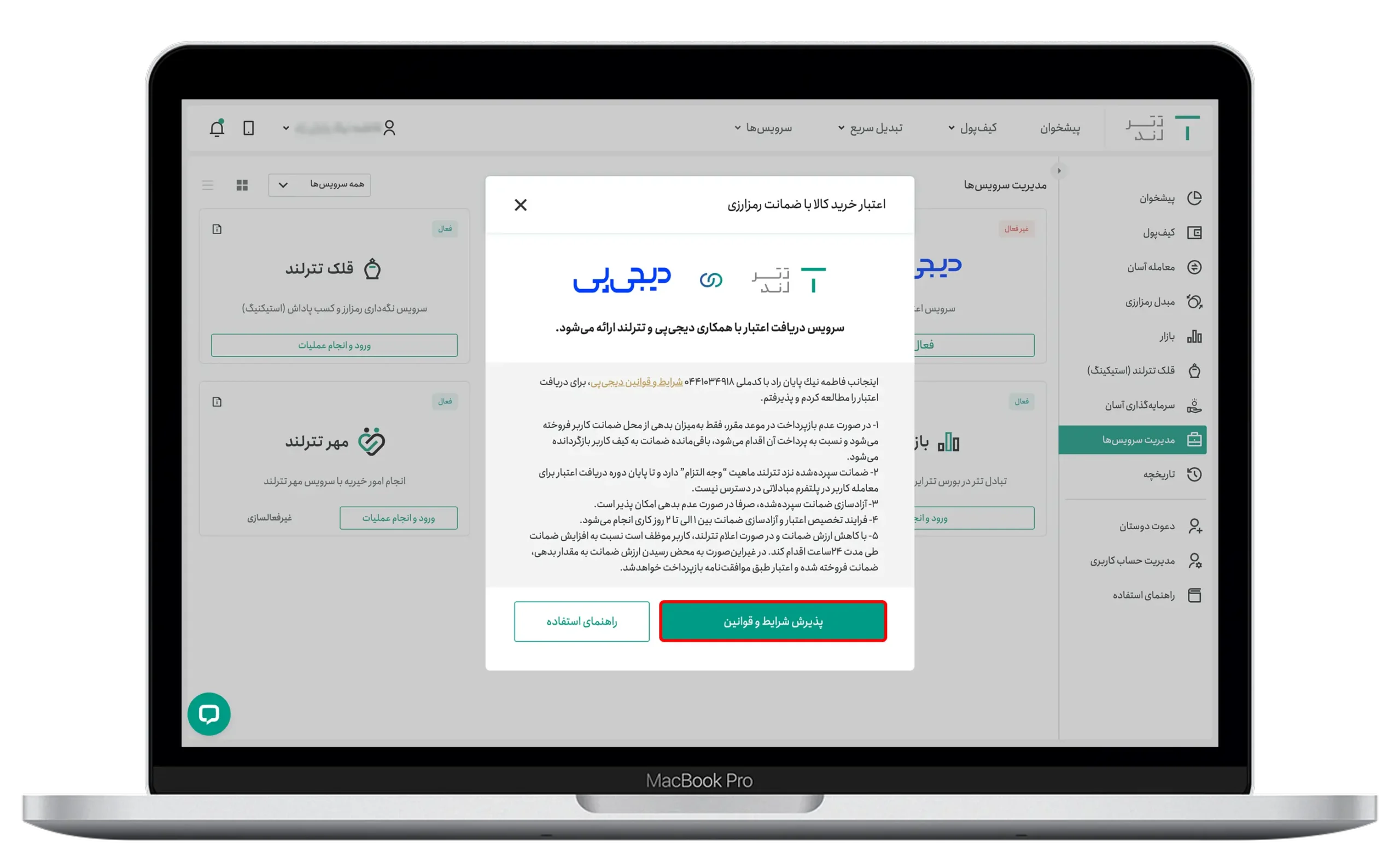 در مرحلهی بعد، متن شرایط و قوانین دیجیپی برای شما نمایش داده میشود. پس از مطالعه، گزینهی پذیرش شرایط و قوانین را انتخاب کنید تا به مرحله بعد بروید.