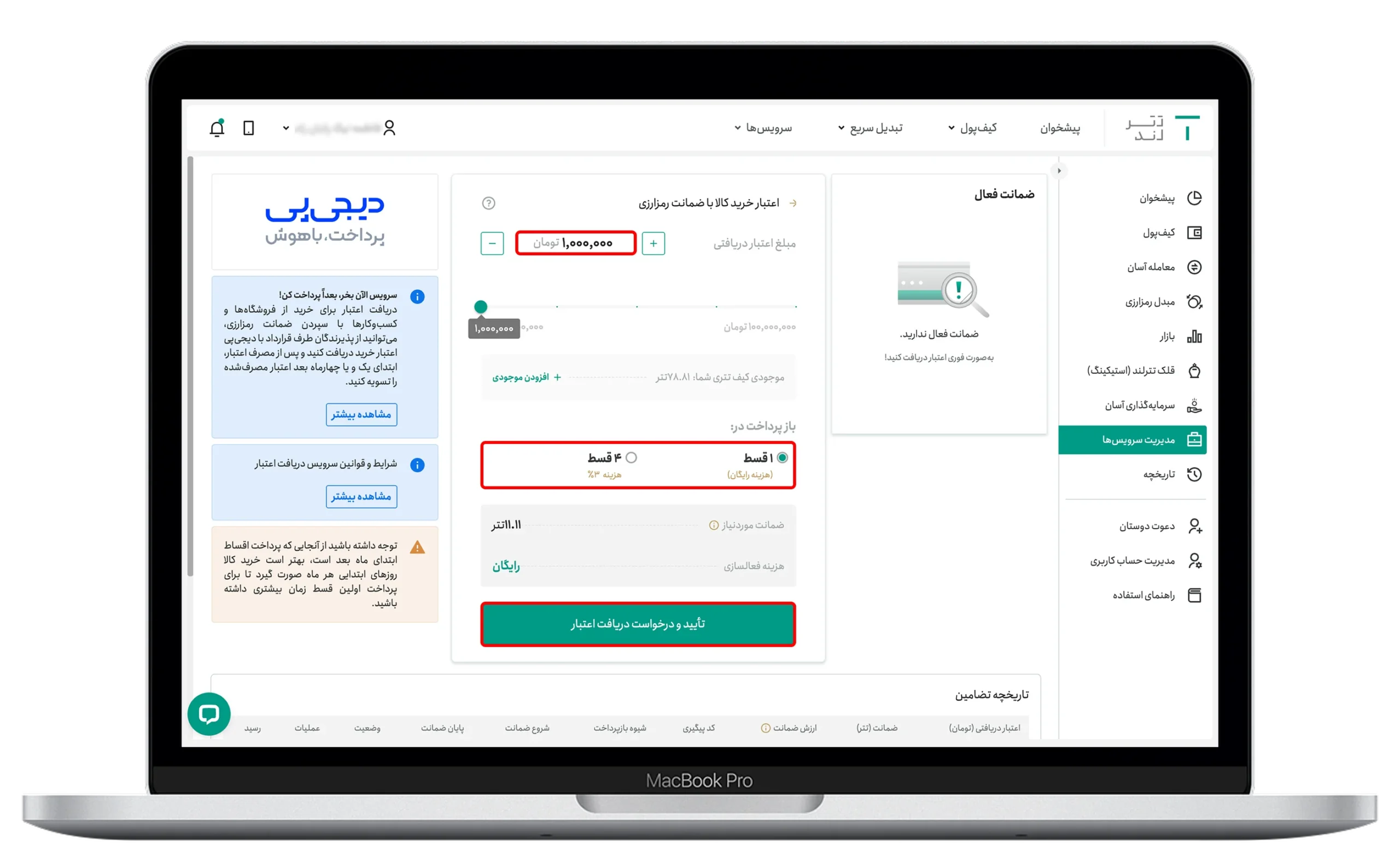 - بازپرداخت ۴ قسطی: در این حالت، کارمزد تتری از موجودی شما کسر میشود و باید اولین قسط را بهصورت ریالی پرداخت کنید.