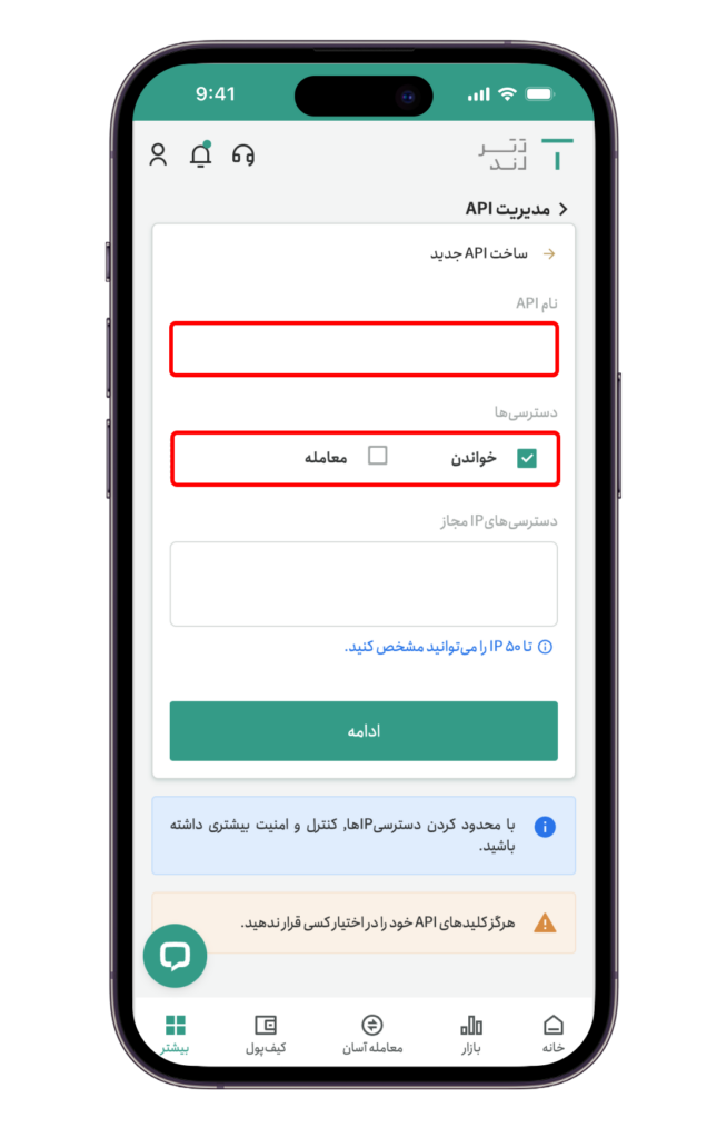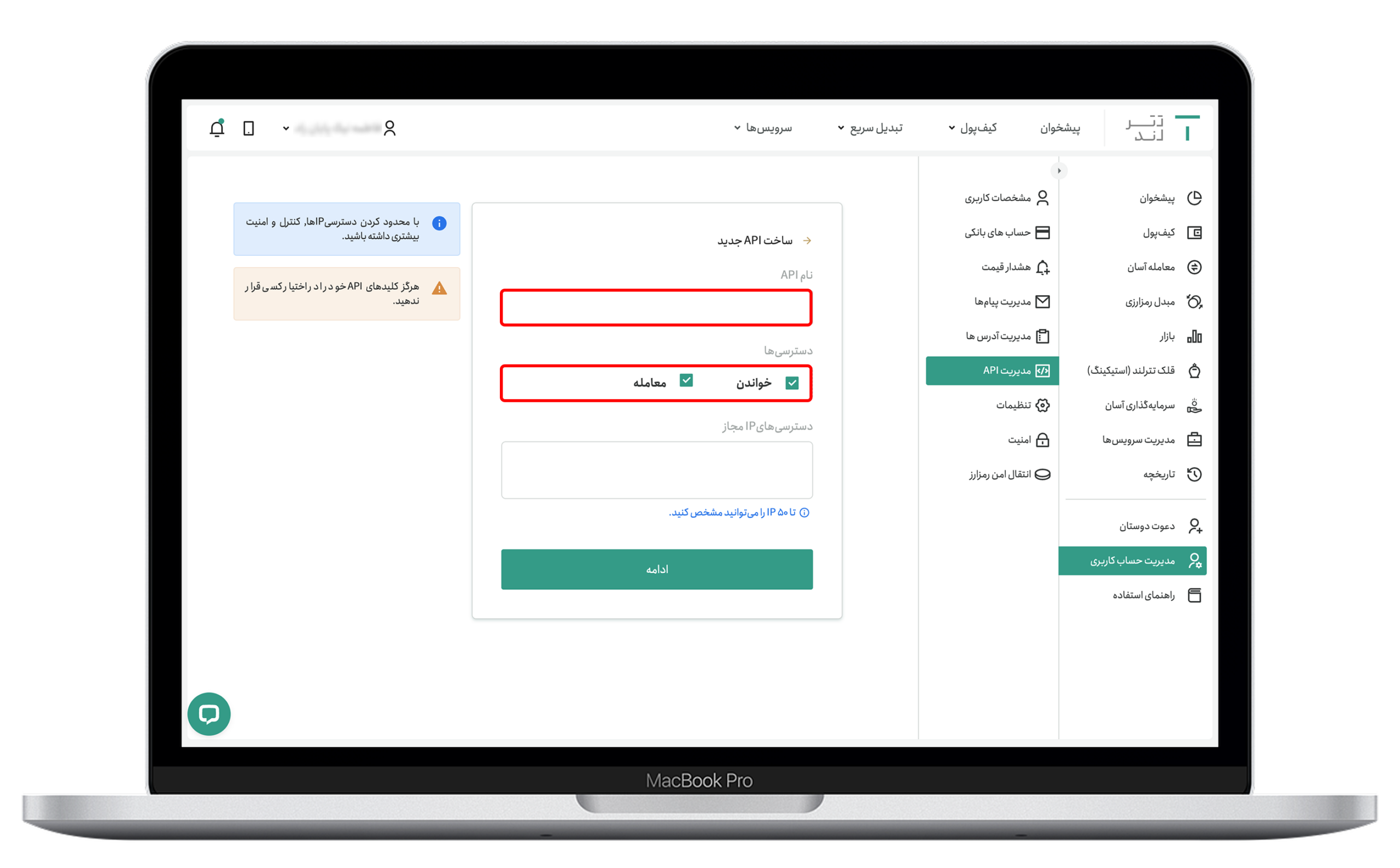 همچنین در این بخش امکان تعریف آدرس IP مجاز برای API وجود دارد. پیشنهاد میشود حتماً فقط IPهای مشخص خودتان را وارد کنید تا امنیت حساب کاربری حفظ شود و از دسترسی افراد غیرمجاز جلوگیری گردد.