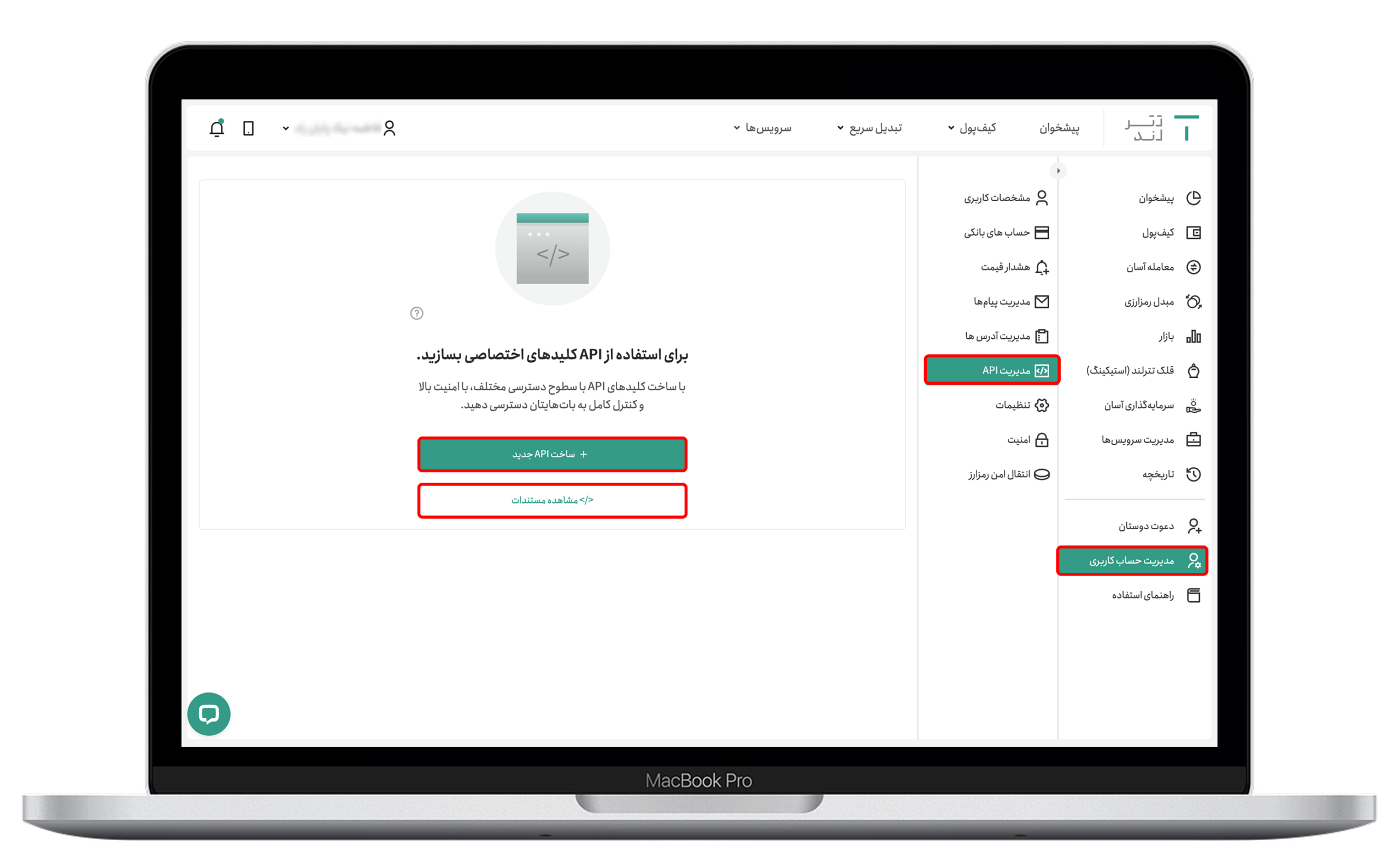 - ساخت API جدید (برای ایجاد کلید اختصاصی دسترسی)