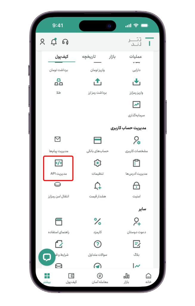 ابتدا وارد حساب کاربری خود در تترلند شوید. سپس از طریق پیشخوان، روی گزینه مدیریت حساب کاربری و سپس مدیریت API کلیک کنید.