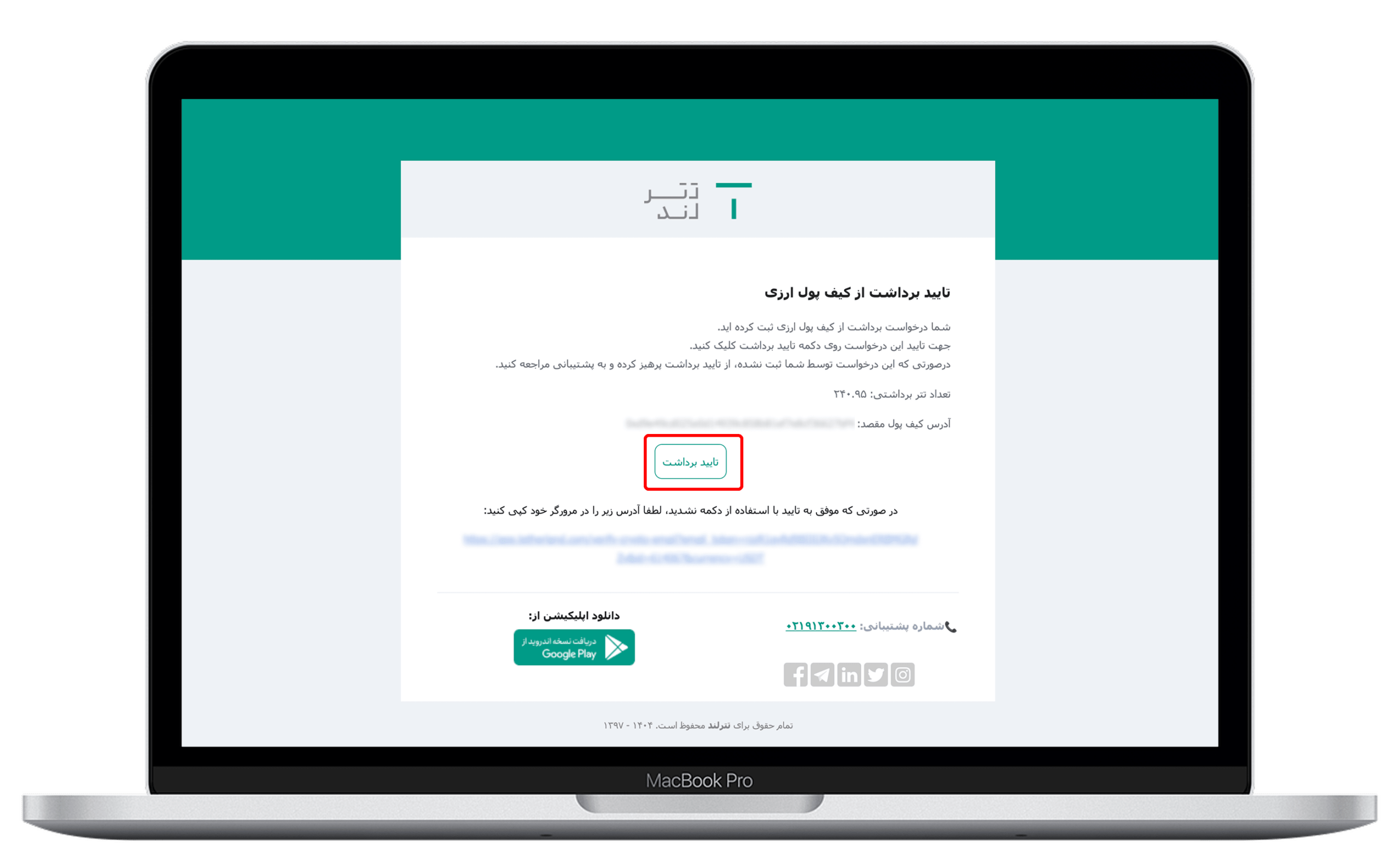 تأیید نهایی برداشت تتر تنها از طریق ایمیلی انجام میشود که به آدرس ثبتشدهی شما در زمان احراز هویت ارسال میگردد.