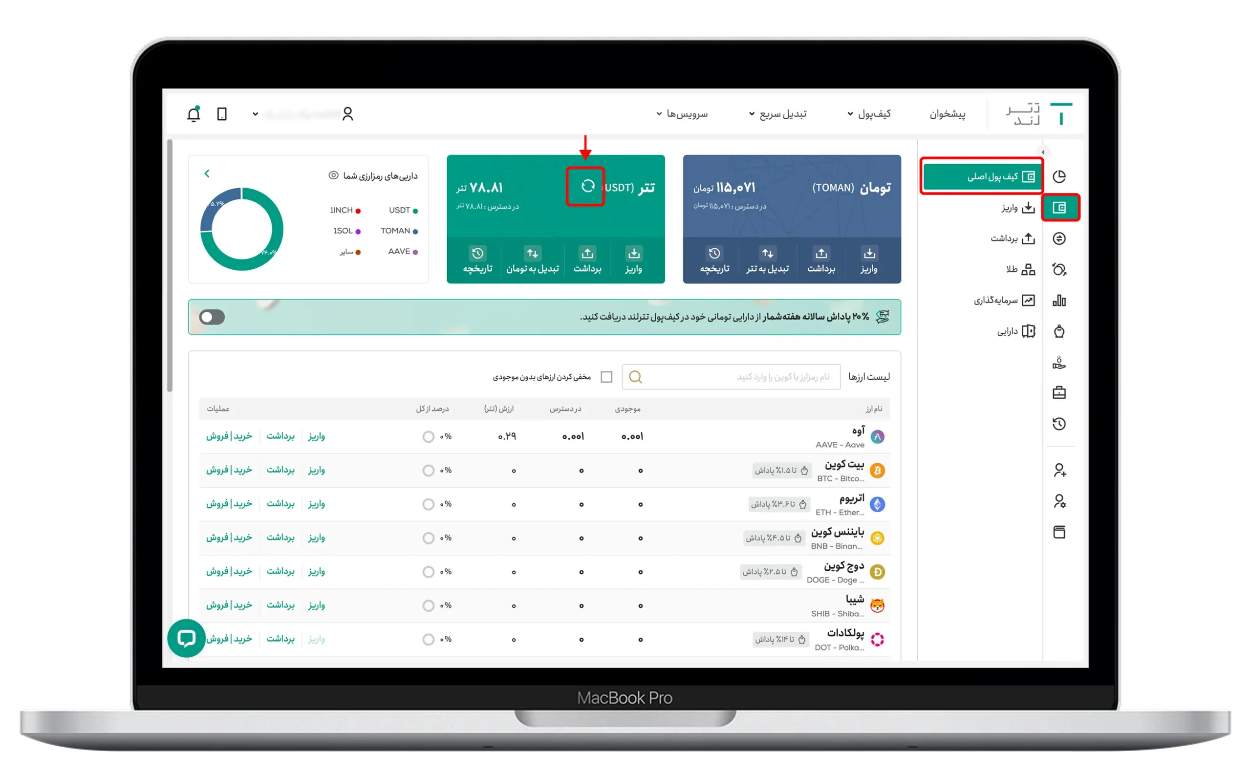 سپس روی دکمهی ریفرش کیفپول تتری کلیک کرده و تا ۵ ثانیه منتظر بمانید تا موجودی بهروزرسانی شود.