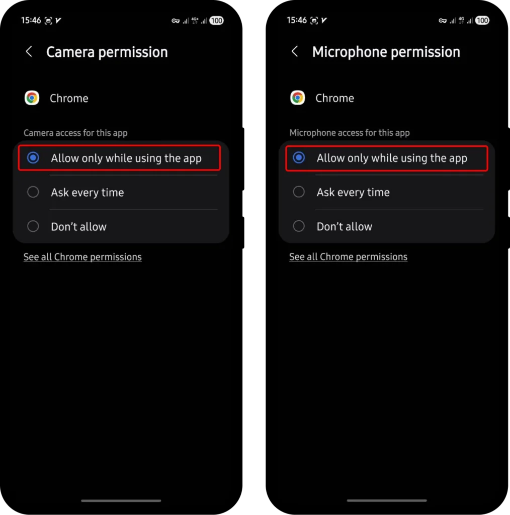 ۶. در صفحهی بازشده، وضعیت دسترسی را روی گزینهی Allow قرار دهید تا مجوز استفاده از دوربین یا میکروفون برای مرورگر فعال شود.