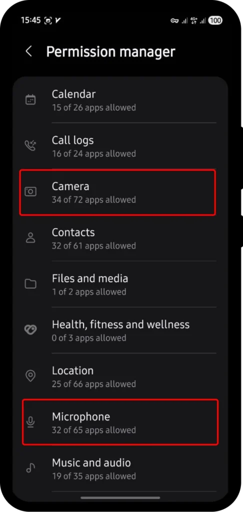 ۴. در این قسمت، یکی از گزینههای Camera یا Microphone را انتخاب کنید.