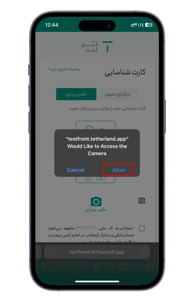 ۵. سپس همانطور که در تصویر زیر مشاهده میکنید، با انتخاب گزینهی Allow، دسترسی به دوربین (Camera) را نیز فعال کنید.