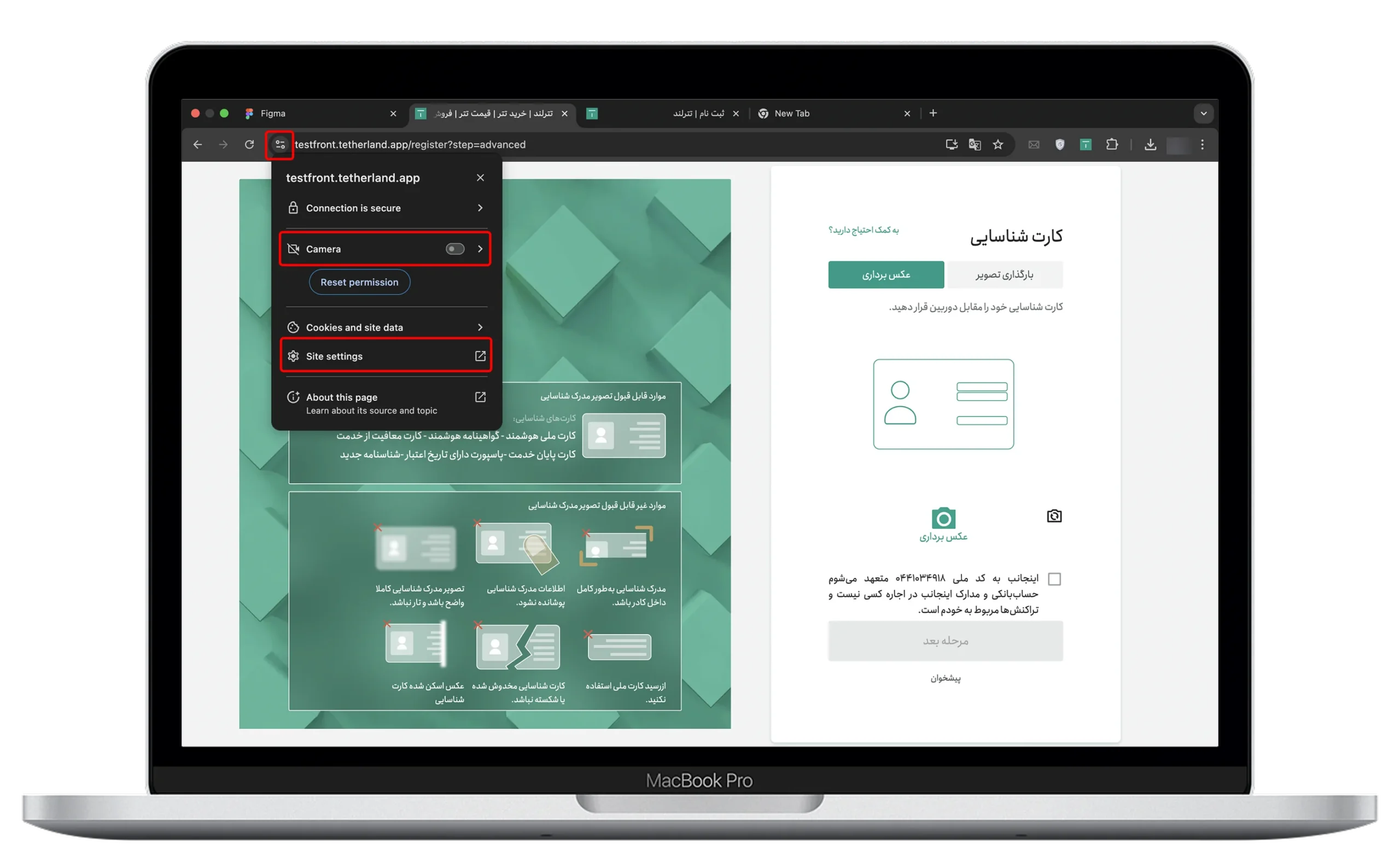 ۲. روی علامت قفل دوربین و یا تنظیمات در کنار نوار آدرس مرورگر کلیک کنید.