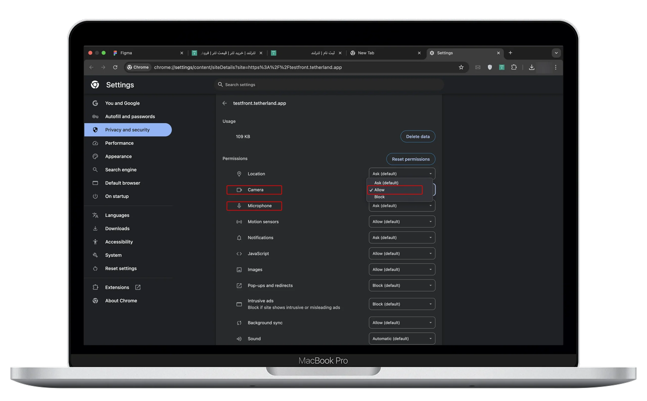 اگر روی Never allow کلیک کنید لازم است دسترسی دوربین و میکروفون را از راه زیر فعال کنید.