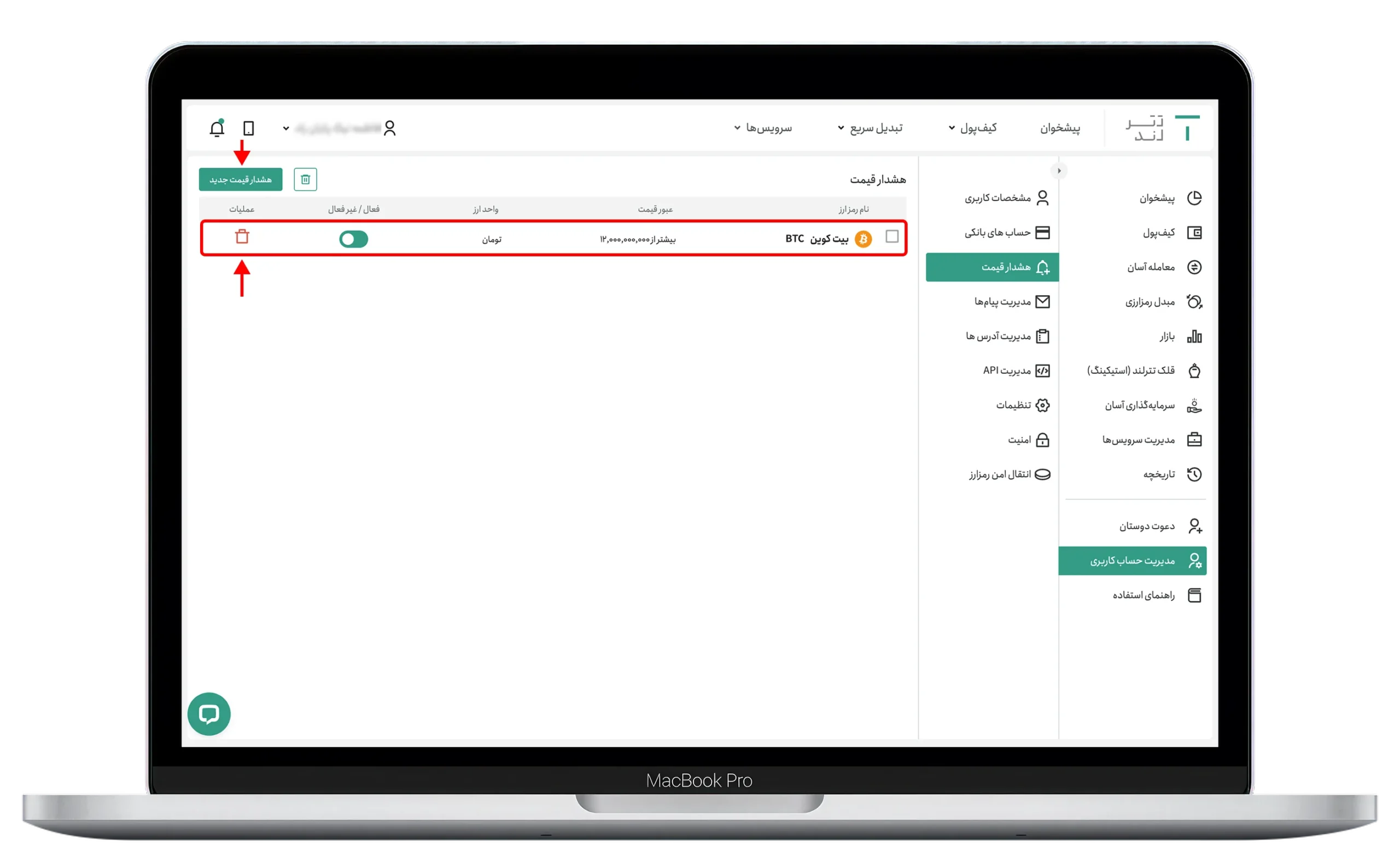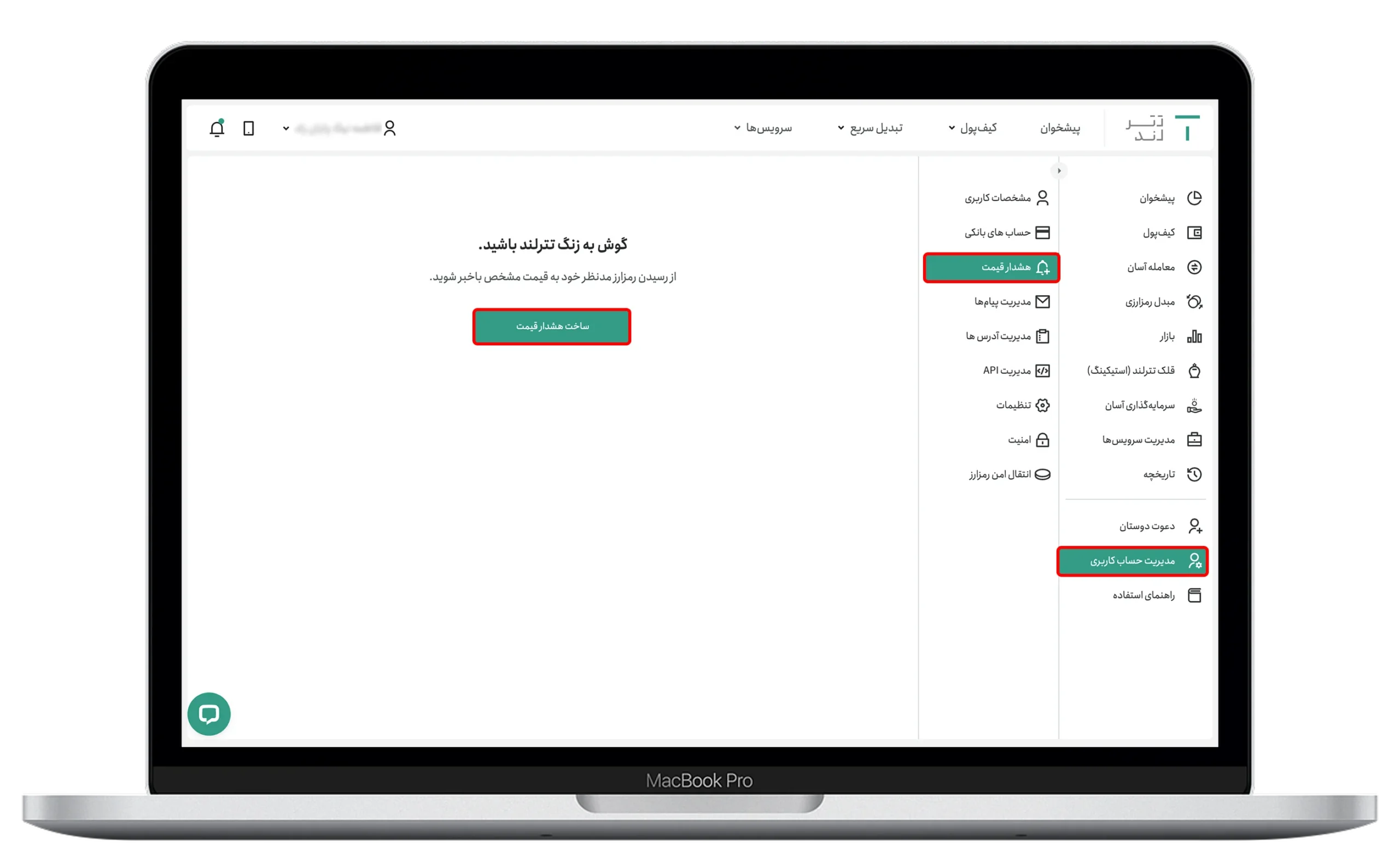 - مدیریت حساب کاربری و انتخاب هشدار قیمت از منو