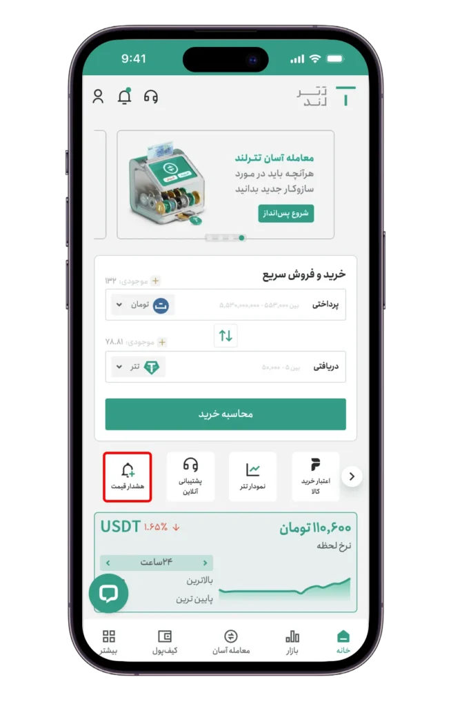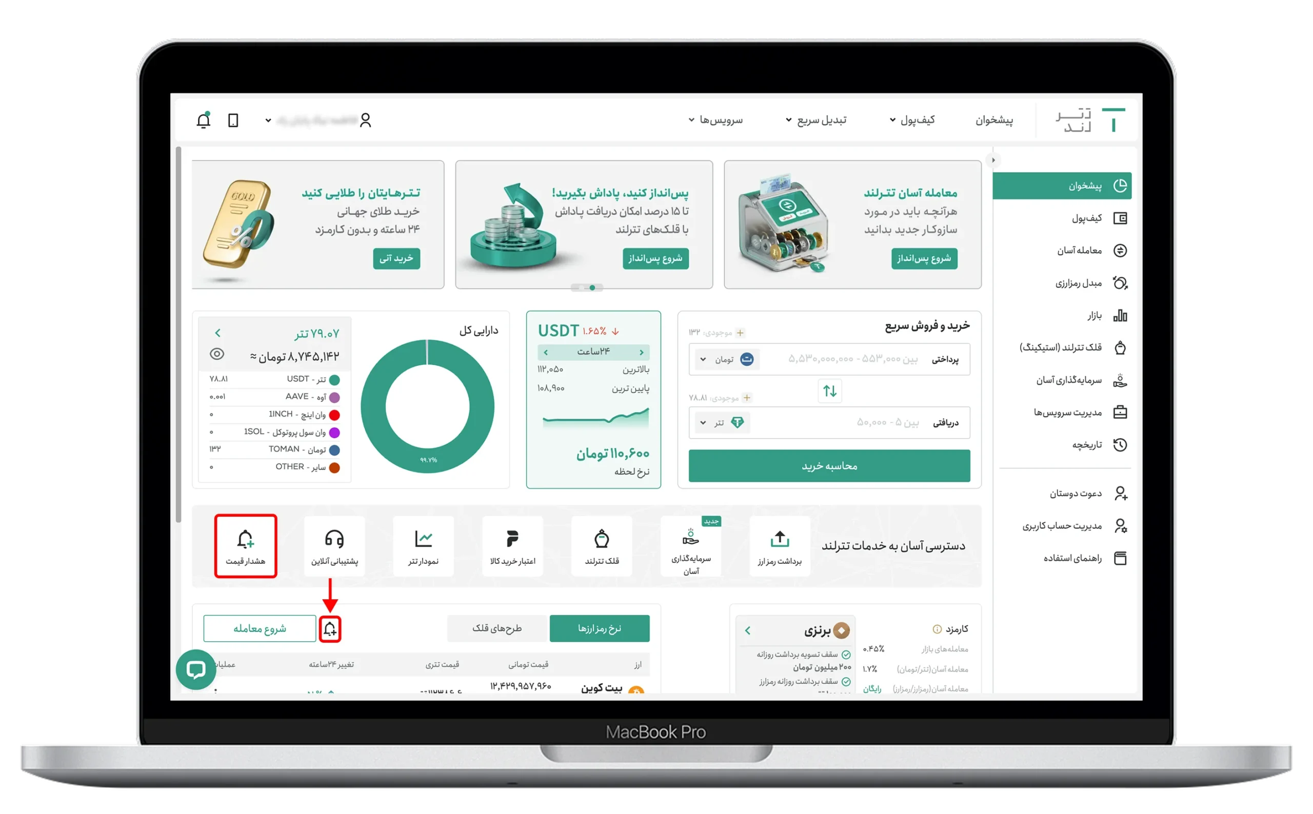 ابتدا وارد حساب کاربری خود در تترلند شوید. سپس از مسیرهای زیر میتوانید به بخش هشدار قیمت دسترسی پیدا کنید: