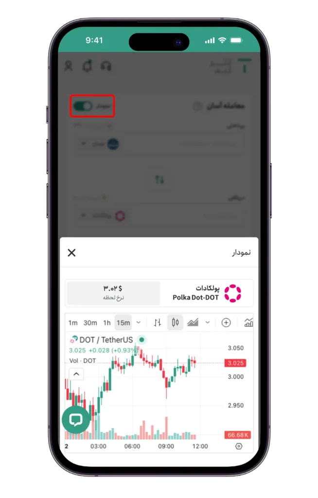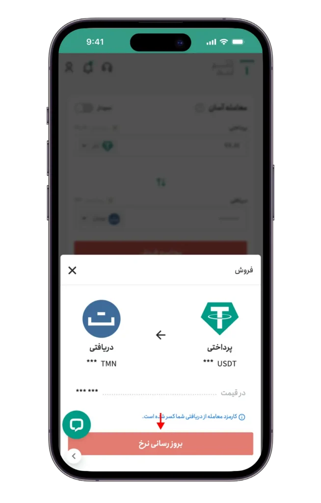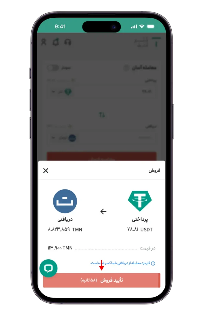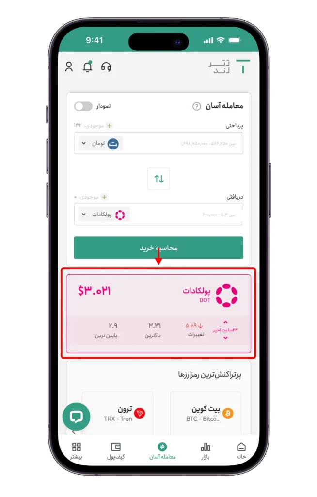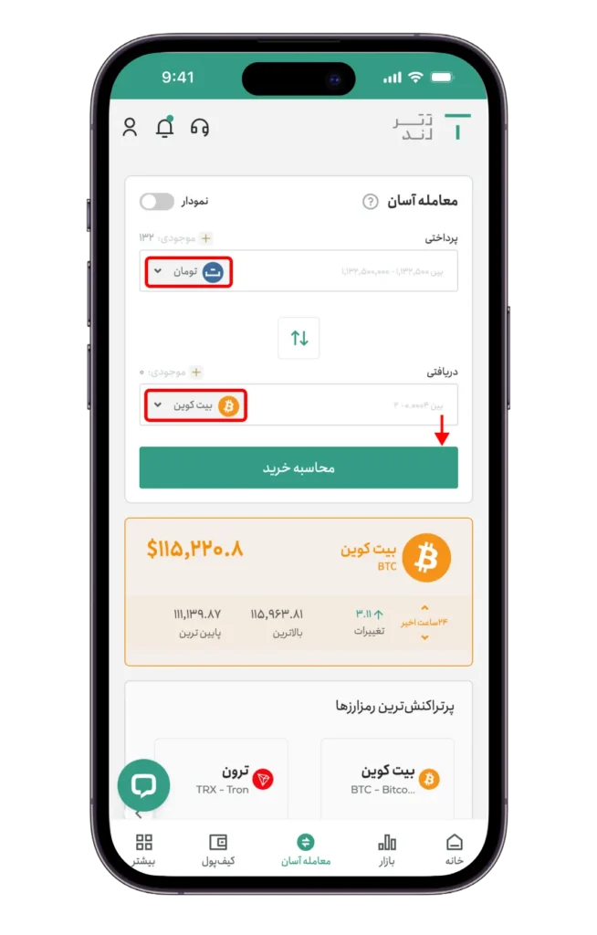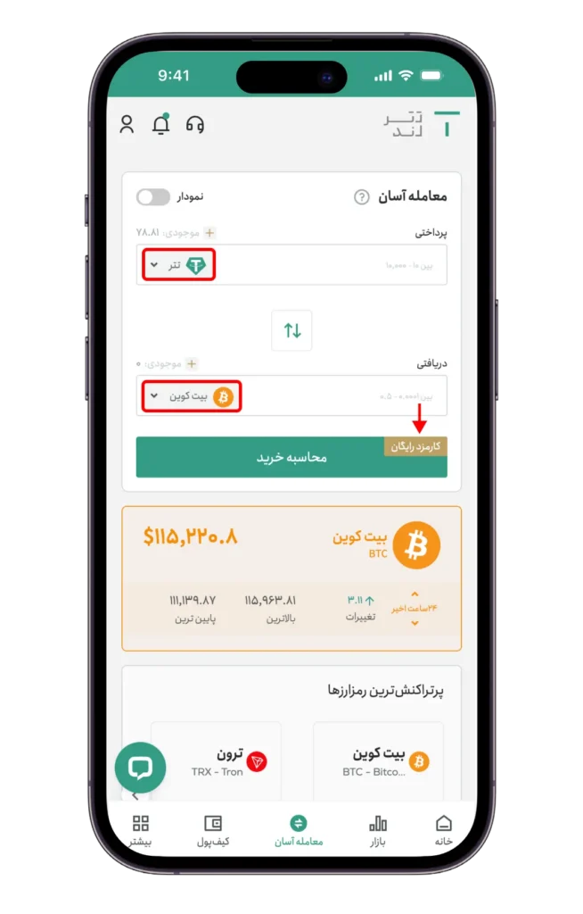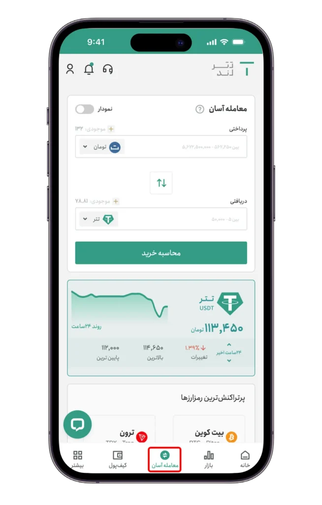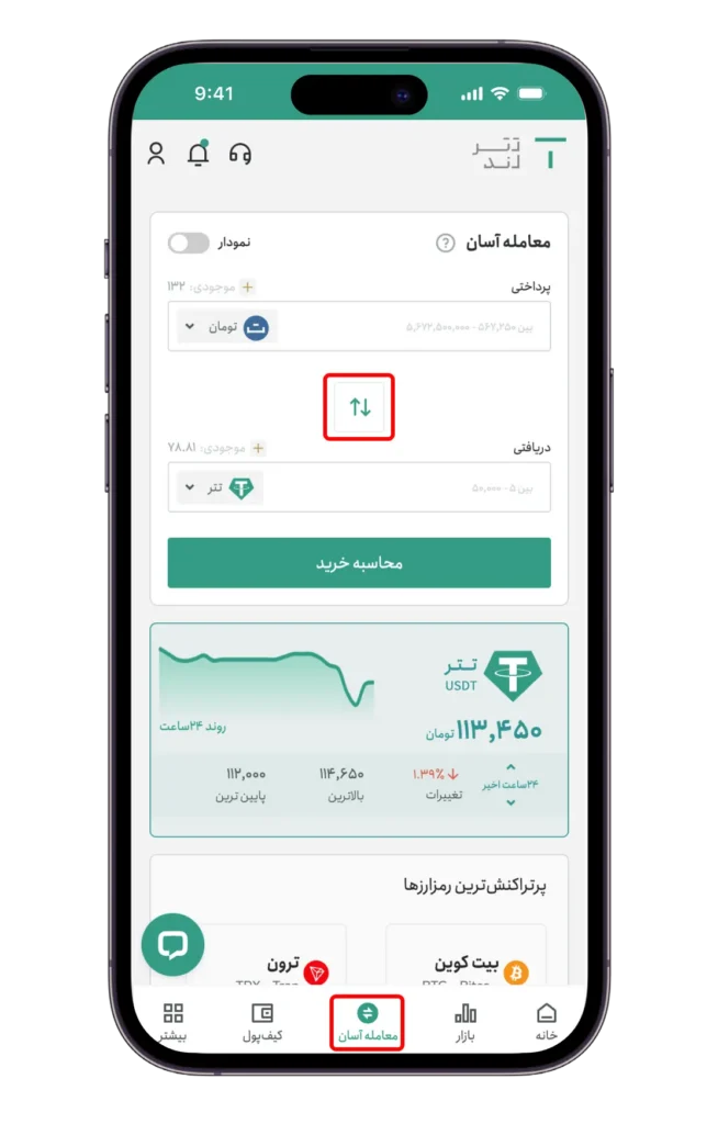۲. پیشفرض معامله برای تبدیل تومان به تتر تنظیم شدهاند.