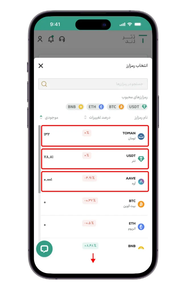 ۳. مشخص نمایید که مایل هستید تبدیل بین کدام رمزارز و تتر یا تومان باشد.