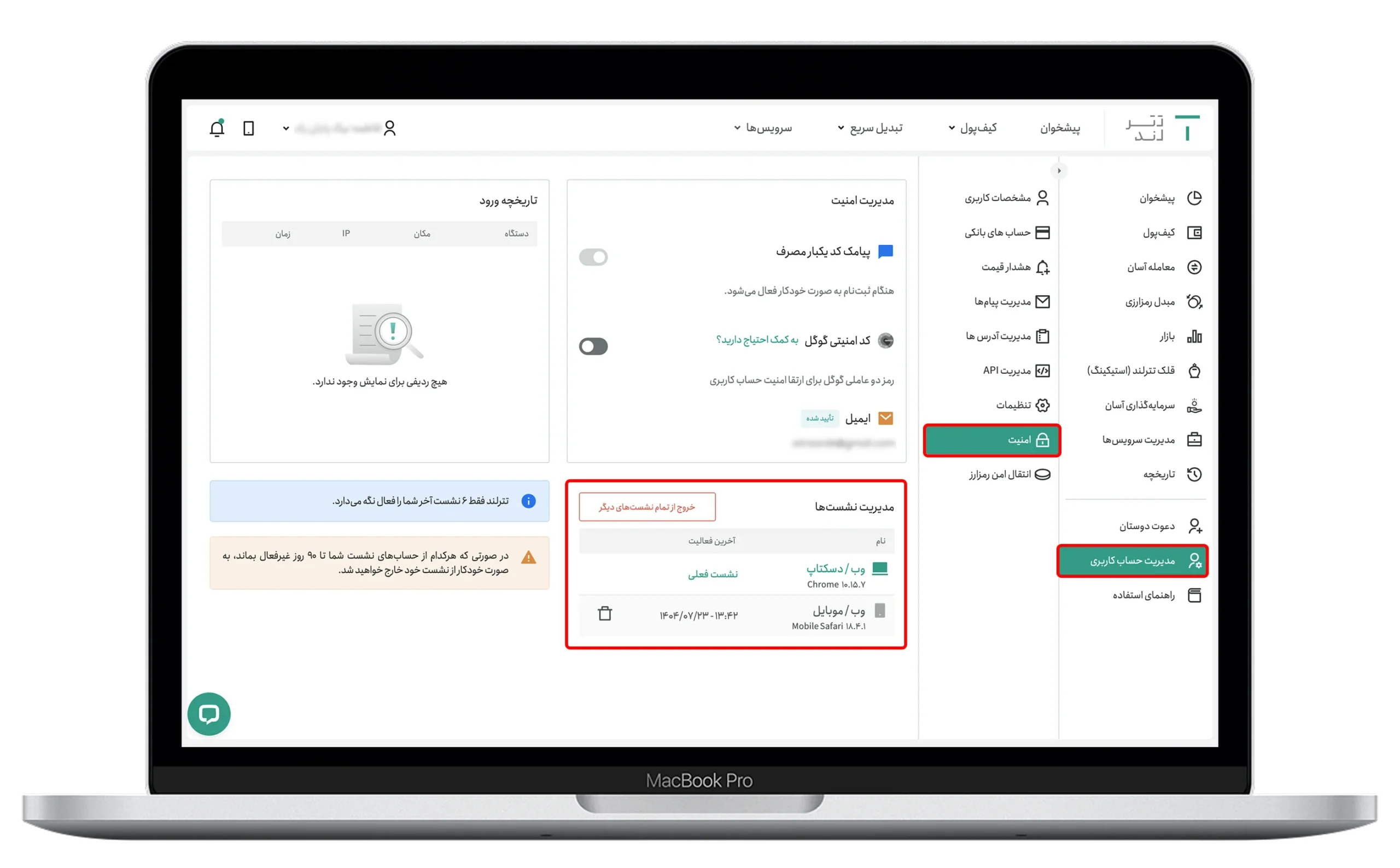 برای مشاهده آخرین فعالیتها و دستگاههای متصل به حساب خود، از طریق پیشخوان و مراجعه به بخش مدیریت حساب کاربری و سپس بخش امنیت، وارد بخش مدیریت نشستها شوید. در این بخش میتوانید نام دستگاه، تاریخ و ساعت ورود به حساب کاربری را مشاهده کنید. درصورت نیاز، امکان حذف دستگاههای متصل نیز برای شما فراهم است.