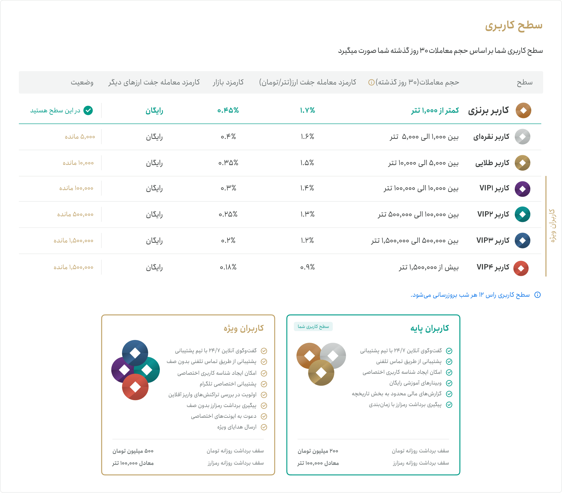 برای مشاهده جزئیات بیشتر درباره کارمزدها و مزایای هر سطح، به صفحه کارمزد مراجعه کنید.