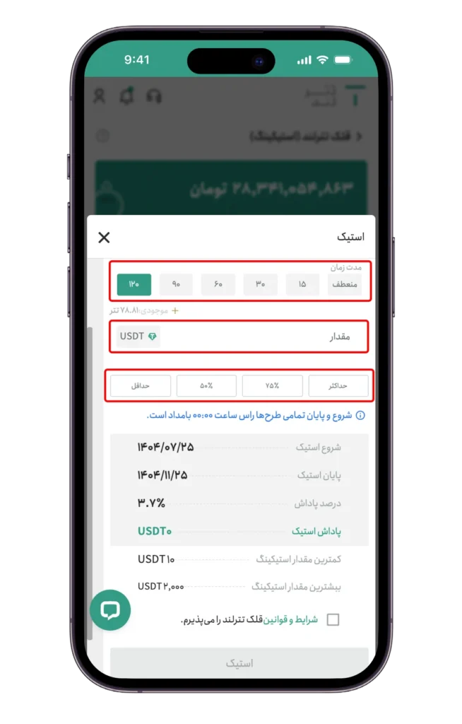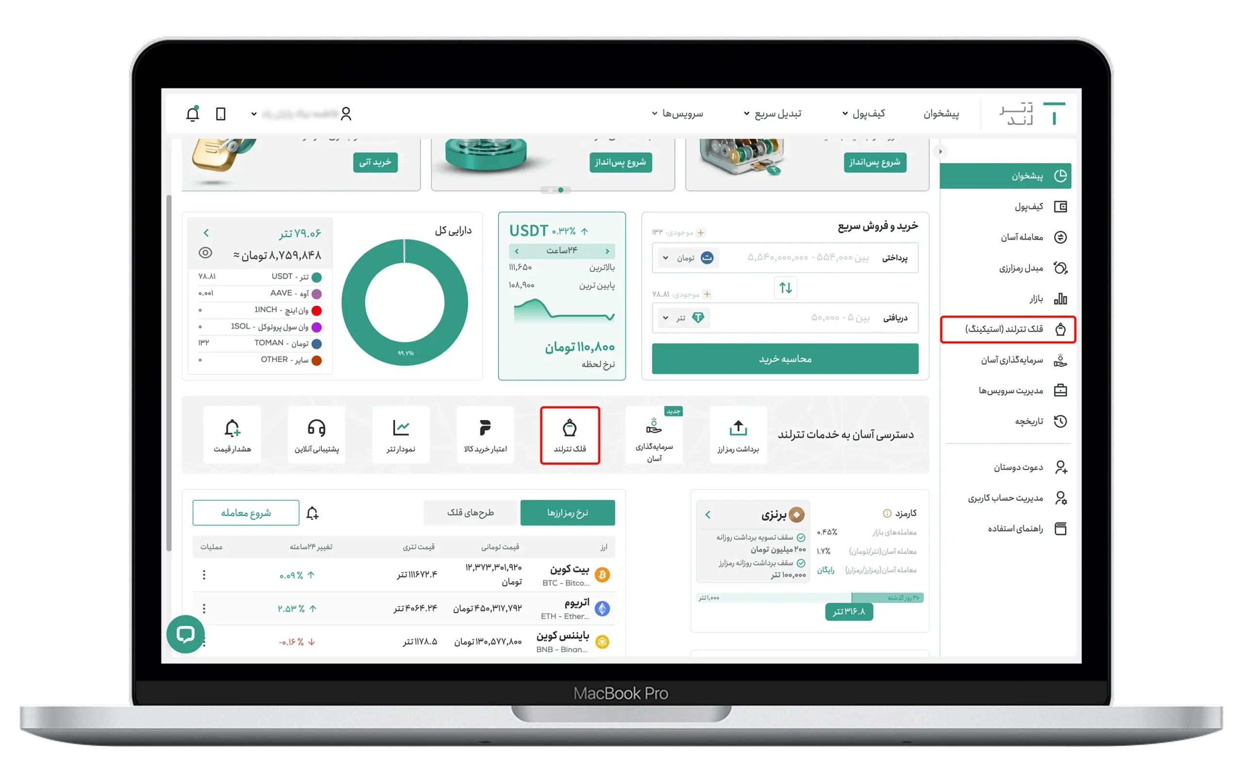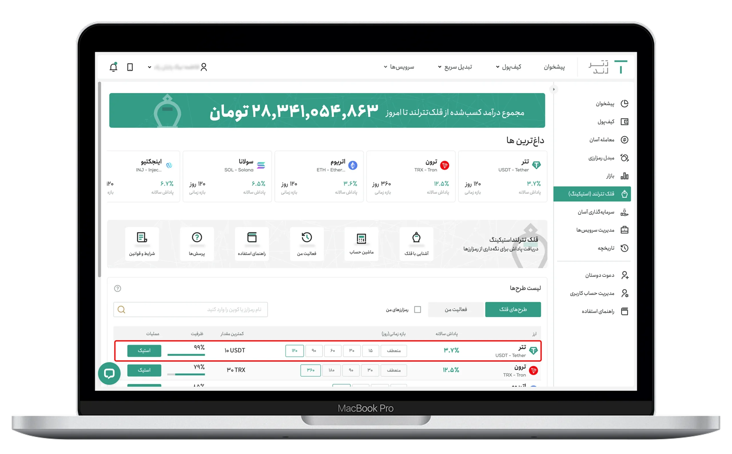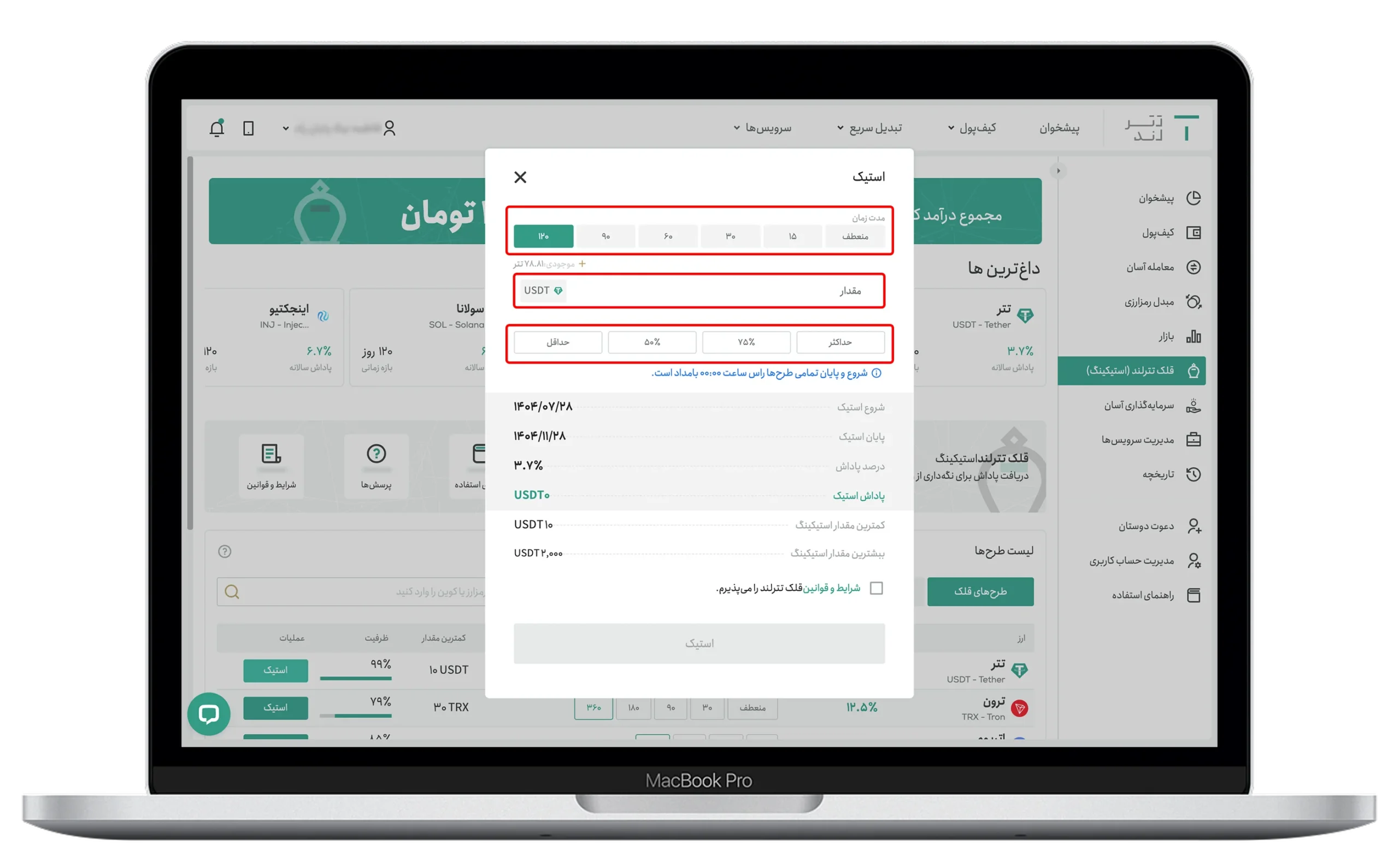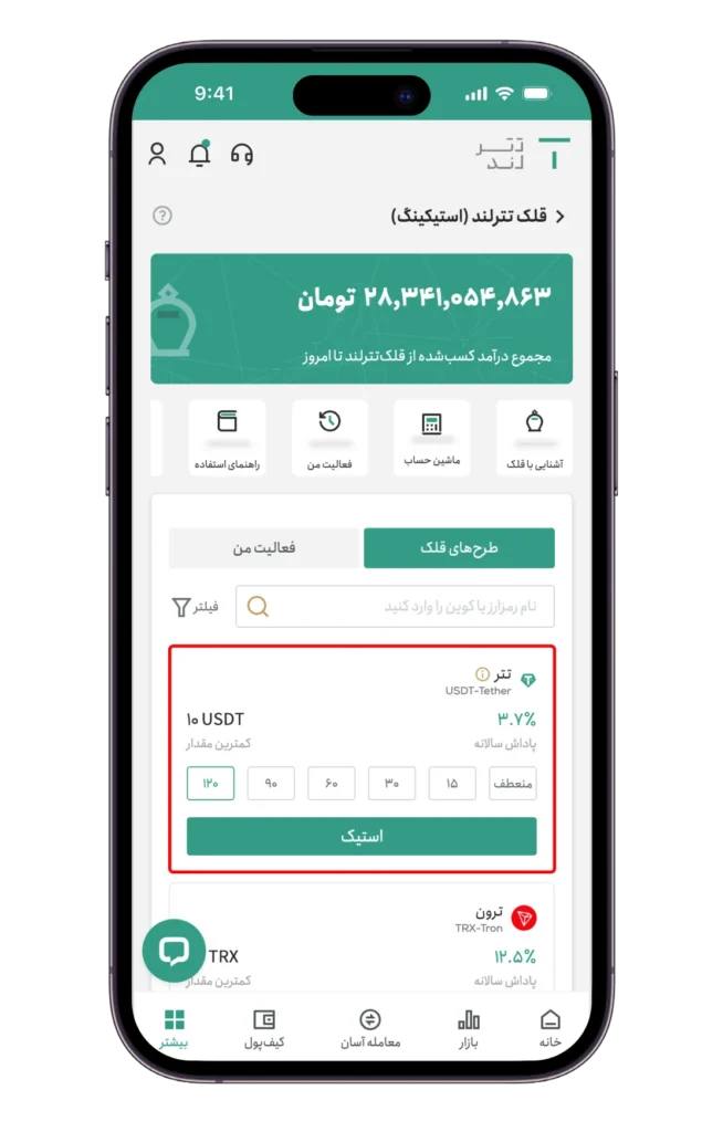 ۱. برای استفاده از سرویس قلک تترلند، ابتدا وارد حساب کاربری خود شوید و از منوی اصلی، قلک تترلند(استیکینگ) را انتخاب کنید.