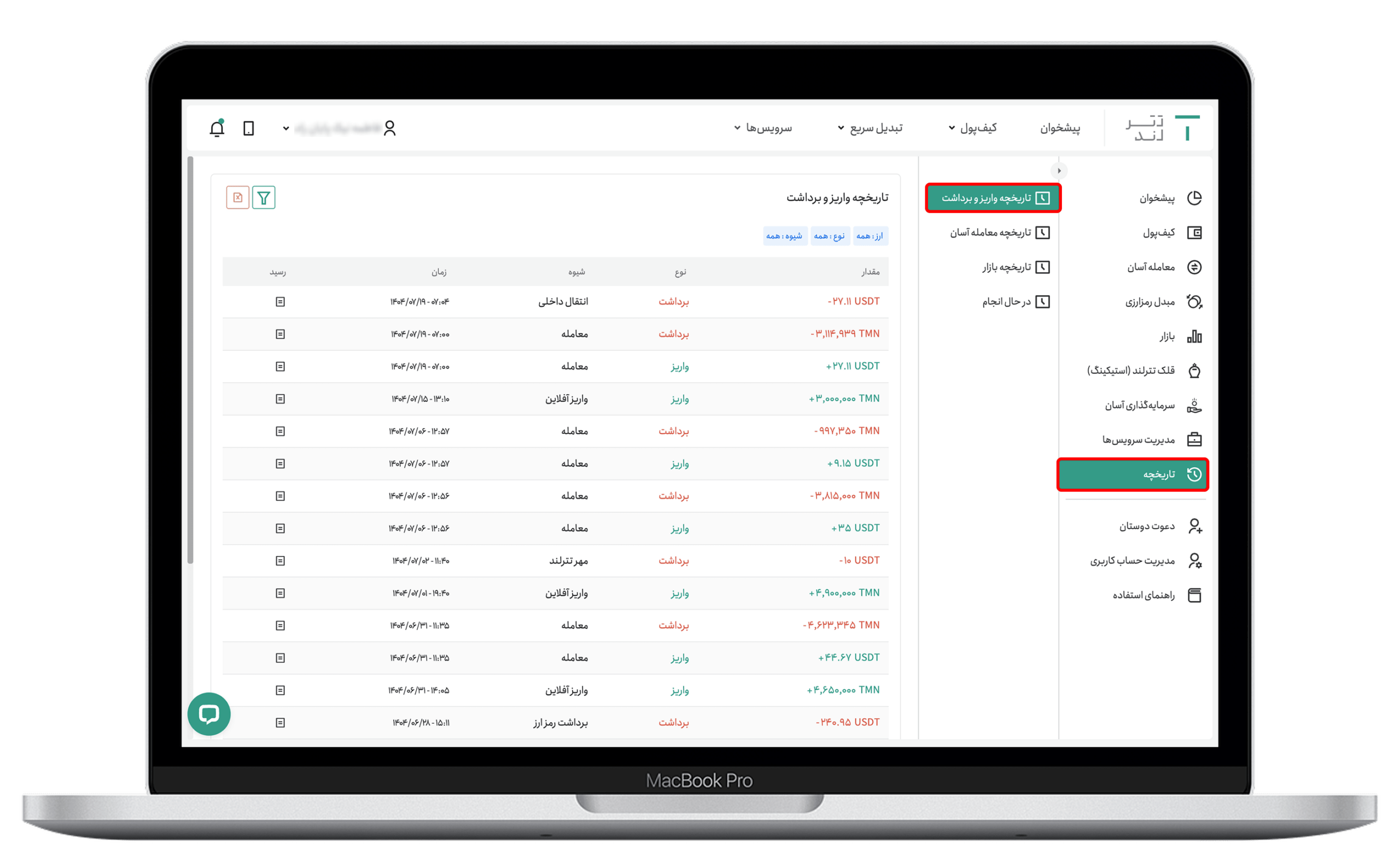 برای مشاهده تراکنشهای مربوط به واریز و برداشت، وارد تب تاریخچه واریز و برداشت شوید. در این بخش جزئیات تمامی تراکنشهای مالی شما نمایش داده میشود.