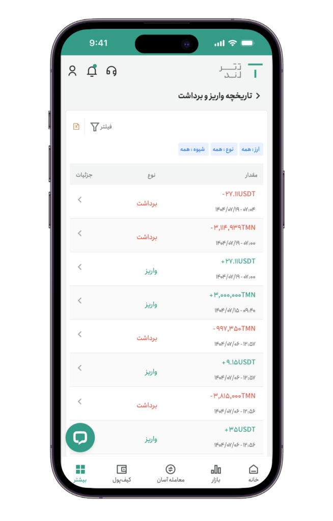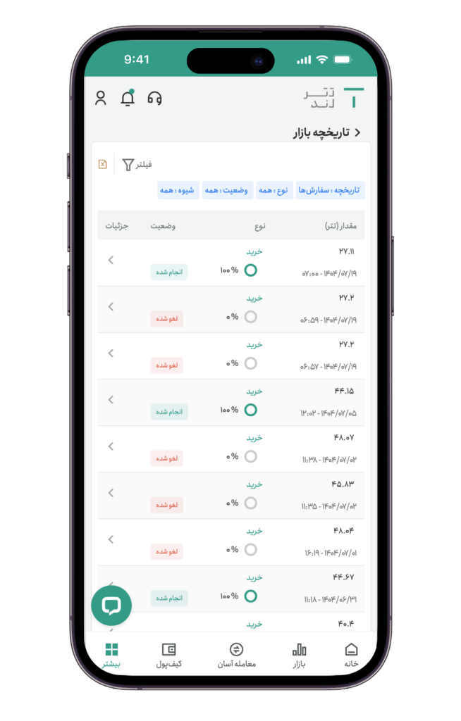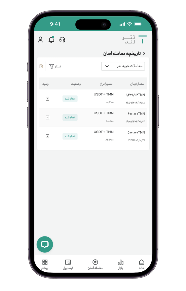 برای مشاهده سوابق معاملات بازار، وارد تب تاریخچه بازار تترلند شوید. در قسمت فیلترها امکان نمایش در وضعیتهای مختلف و شیوهها بههمراه جزئیات کامل و رسید هر تراکنش قابل مشاهده است.