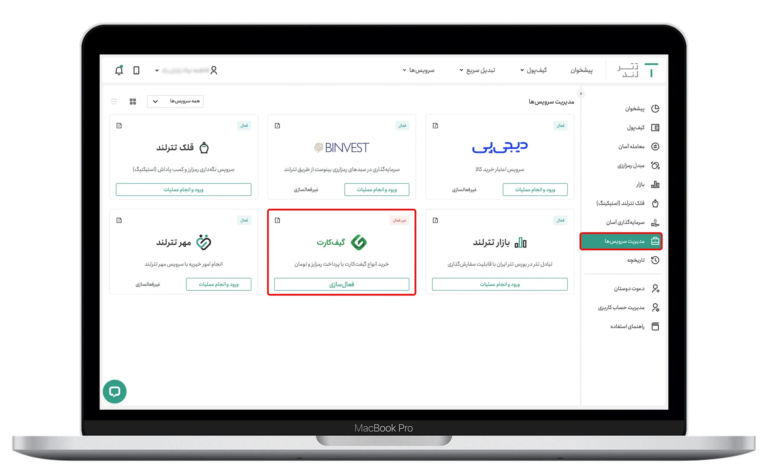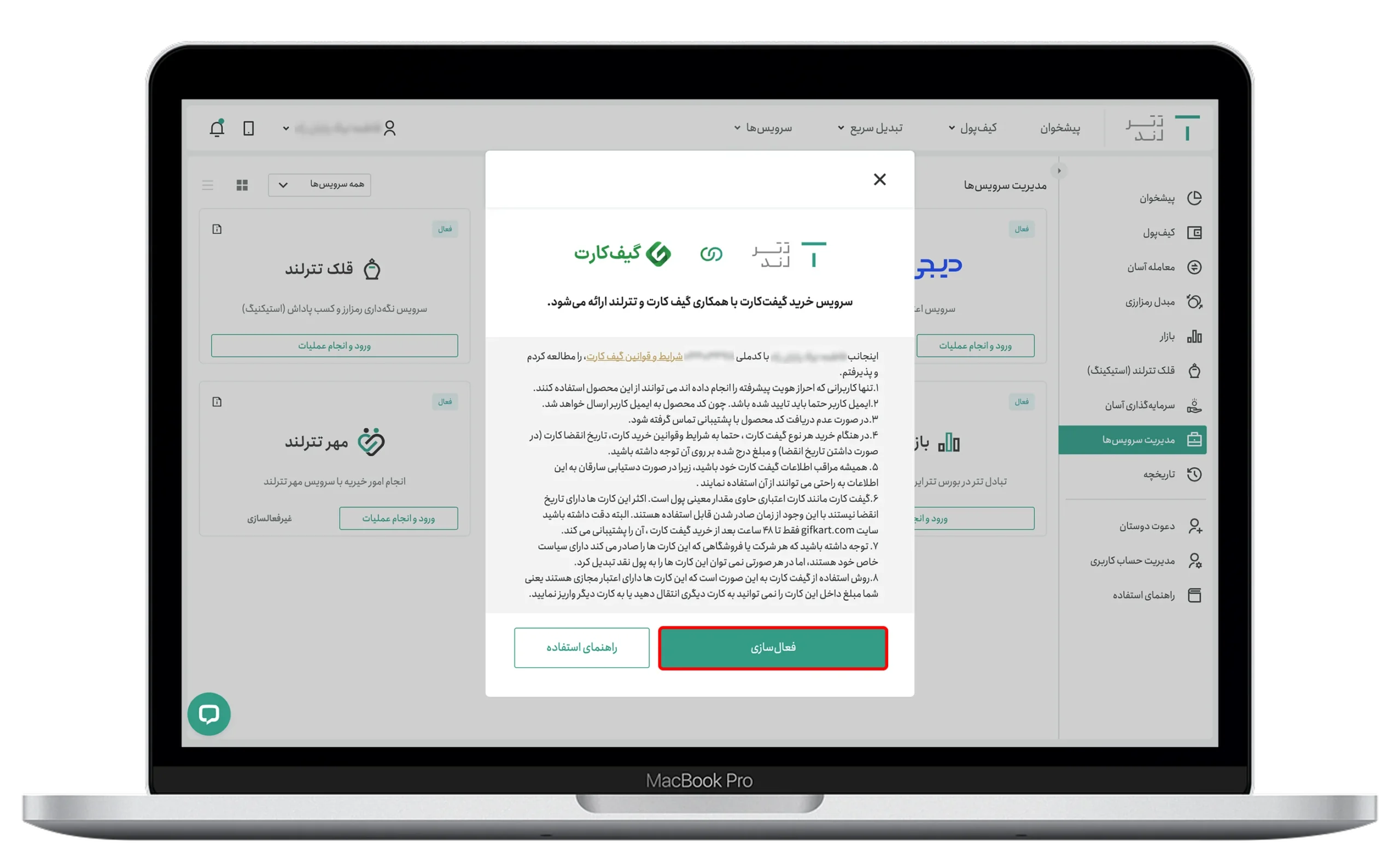 در این بخش، سرویس گیفتکارت را انتخاب کرده و روی گزینه فعالسازی کلیک کنید.