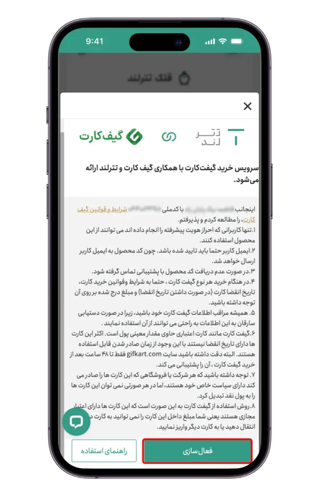 پس از مطالعه دقیق، گزینه پذیرش شرایط و قوانین را انتخاب کنید تا سرویس برای شما فعال شود.