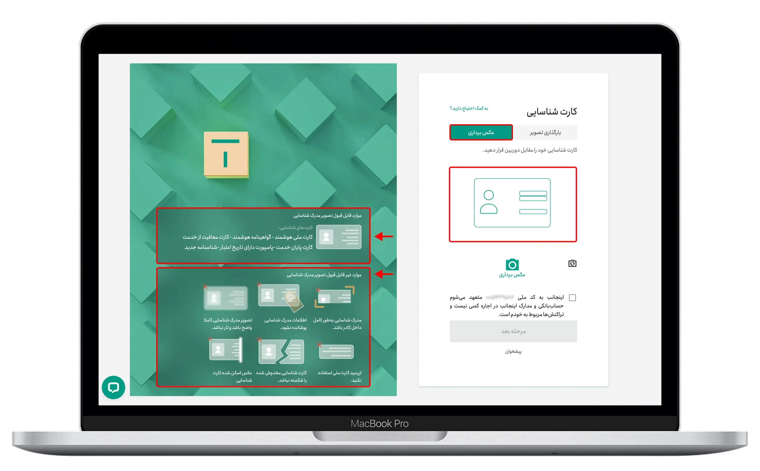 در این روش، ابتدا مجوز دسترسی به دوربین دستگاه را با کلیک روی گزینه تأیید یا Allow صادر کنید. سپس کارت شناسایی خود را مقابل دوربین قرار دهید و با کلیک روی دکمه عکسبرداری، از آن عکس بگیرید.
